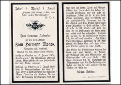 Mitgl. Mütterverein Schelsen; ∞ 11.6.1897 Hermann Mones; 8 K., davon 6 †; dreijähriges Leiden; |