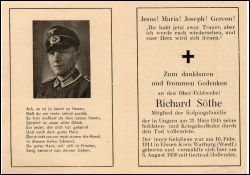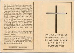 Gefallener 2. Weltkrieg; ∞ 6.8.1938 Gertrud Hollender; 1 Sohn; 29.8.1939 Einberufung; zuerst Westfeldzug, dann in Russland; 1941 verlor er durch schwere Kopfverletzung das rechte Augenlicht; trotzdem als Ausbilder in Italien und dann Ungarn im Dienst; Mitgl. Kolpingfamilie |