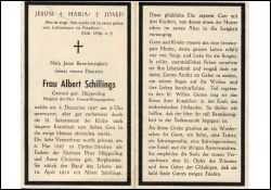 Eltern: Peter Hüpperlin u. Anna Christina geb. Berghausen; ∞ 15.4.1912 Albert Schillings; 3 K., davon 1 früh †; längere Krankheit; Mitgl. Frauen-Kongregation |