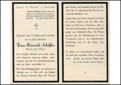 Längeres Leiden; Eltern: Heinrich Hütz u. Gertrud geb. Kaulen; ∞ 19.5.1921 Heinrich Schiffer, † 9.11.1935; |