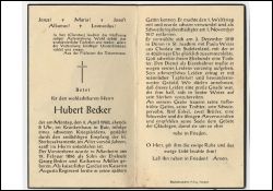 Wohnort: vermutl. Manheim; Eltern: Georg Becker u. Katharina geb. Müller; kaiserlicher Gardist im Kaiserin-Augusta-Regiment; lernte dabei seine Gattin kennen; im 1. Weltkrieg schwer verwundet; als Schwerkriegsbeschädigter am 1.11.1917 entlassen; ∞ 3.12.1919 in Düren Paula Weiss aus Chodau im Sudetenland; 1 Tochter; wegen seines Leidens musste er seinen Dienst als Eisenbahner vorzeitig aufgeben |