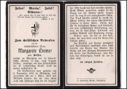 ∞ 1.3.1878 Wilhelm Cremer, † 28.12.1881; Kinder; seit 5 J. vollständig erblindet; gepflegt von ihrem einen, überlebenden Sohn |