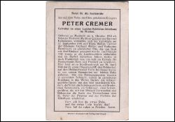 Gefallener 2. Weltkrieg; Eltern: Matthias Cremer u. Gertrd geb. Kalscheuer; ∞ 12.9.1930 Klara Müller, Tochter der Ehel. Gerhard Müller u. Katharina geb. Heutergers; 5 K.; Frühjahr 1941 Einberufung; Tod bei Fliegerangriff; Heldenfriedhof Ferin b. Douai |