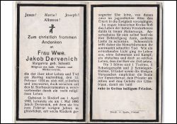 Wohnort: vermutl. Elsdorf; Mitgl. Frauen- u. Mütterverein; ∞ 1.5.1886 Jakob Dervenich, † Febr. 1933; 6 K., davon 2 jugendl. †; |