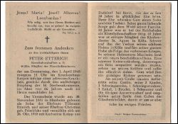 Eltern: Tillmann Etterich u. Christina geb. Friedrichs; ∞ 26.10.1918 Katharina Knipp aus Duisdorf b. Bonn; 2 K.; 42 J. als Eisenbahnschaffner bei der Reichsbahn; Mitgl. Kirchenchor St. Agnes in Köln; sein Heim in Köln durch Luftangriff zerstört; deshalb Rückkehr in Heimatort Manheim; Knieamputation |