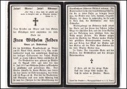 Wohnort: Manheim; ∞ 8.7.1917 Wilhelm Felden aus Manheim; 3 K., davon 2 †; jüngstes Kind erst 10 Tage alt |