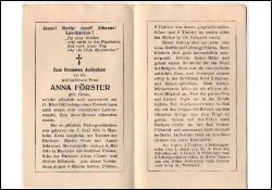 Herzschlag; Eltern: Martin Gross u. Agnes geb. Schreiner; ∞ 8.5.1915 in Manheim Martin Förster, Sohn der Ehel. Alban Förster u. Helene geb. Röbsteck (Roebsteck); 8 K., davon 4 früh †; Mitgl. Kath. Mütterverein; gegen Kriegsende evakuiert, dabei auf der Fahrt nach Sachsen gestorben; 4 überlebende Töchter; 1 Schwiegersohn am 30.3.1944 im 2. Weltkrieg gefallen |