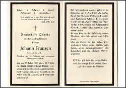 Bahnwärter a.D.; Mitgl St. Albanus u. Leonardus Schützenbruderschaft; Eltern: Wilhelm Franzen u. Katharina geb. Müller; ∞ 23.4.1921 in Manheim Margaretha Klütsch; 1 Sohn; Druck in Kerpen |