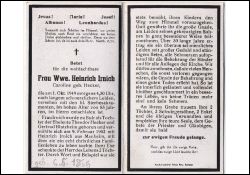 Wohnort: vermutl. Manheim; 83 J.; Eltern: Theodor Hecker u. Gertrud geb. Blatzheim; ∞ 9.2.1902 Heinrich Irnich aus Manheim; 2 Töchter; über 30 Jahre lang schmerzhaftes Leiden; |