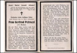 Wohnort: vermutl. Manheim; längeres Krankenlager; Eltern: Johann Becker u. Adelheid geb. Gey; ∞ 6.11.1904 Christian Petrozzi, Sohn von Paul Petrozzi u. Ursula geb. Blum aus Grouven, Pfarre Berrendorf; 8 K., davon 3 †; |