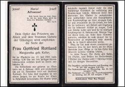 Wohnort: Manheim; ∞ 15.11.1919 Gottfried Rottland; 1 Sohn; sie selbst kränkelte 5 J. lang und war dann an das Bett gefesselt, ihre Mutter pflegte sie |