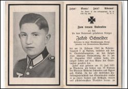 Gefallener 2. Weltkrieg; am 22.12.1942 schwer verwundet; Eltern: Wilhelm Schneider, † 4.12.1935, u. Agnes geb. Klütsch; März 1942 Einberufung, Mai 1942 Einsatz im Osten; Heldenfriedhof in Radom |