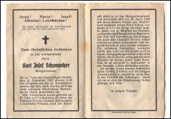 Wohnort: vermutl. Manheim; Metzgermeister; Eltern: Förster Laurenz Schumacher u. Katharina geb. Wilkens; ∞ 20.4.1920 Anna Sophia Kaiser aus Sindorf; 3 Söhne; Mitgl. Kirchenvorstand in Manheim; im Krieg verwüstetes geschäft wieder aufgebaut; 2 Söhne in Kriegsgefangenschaft |