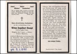 Wohnort: Manheim; Mitgl. Frauen- u. Mütterverein Manheim; Eltern: Heinrich Esser u. Odilia geb. Erken; ∞ in Manheim 16.2.1901 Engelbert Stumpf aus Hochneukirchen, † 24.12.1943; kinderlos; zog nach Tod ihres Mannes zurück ins Elternhaus in Manheim, wo sie den durch Krieg schwer getroffenen Verwandten half |