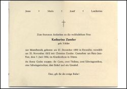 Wohnort: Morschenich; ∞ 22.11.1912 Christian Zander; 2 überlebende Töchter |