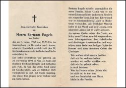 Wohnort: Sindorf; Eltern: Ferdinand Engels u. Katharina geb. Fuhs; ∞ 22.10.1925 Maria Kersting; 3 K.; 47 J. mit dem Erftverband verbunden; liebte Musik u. Gesang; schweres Leiden |