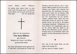 Mitgl. Frauen- u. Müttergemeinschaft Kalkar; Eltern: Ehel. Heinrich Sch∞fs; ∞ 11.9.1906 Johann Höfkens aus Kalkar, † 10.10.1949; 12 K., davon 4 †; |