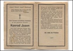Gefallener 2. Weltkrieg; Todesnachricht erst nach fast Eltern: Adam Jusen u. Anna Elisabeth geb. Meuser; ∞ 2.5.1943 Maria Erken aus Langenich; 2 K. (bei Geburt des 2. Kindes war er bereits gefallen); Hamen in Luxemburg; Druck in Kerpen |