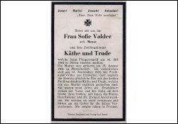 Opfer 2. Weltkrieg; starb mit 9 J. bei Fliegerangriff mit Zwillingsschwester u. Mutter; Eltern: Ferdinand Valder aus Etzweiler u. Sofie geb. Meyer |