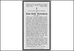 Eltern: Johann und Christine Maur; ∞ 10.10.1911 Lehrer Max Kreuzberg aus Evinghoven, Kr. Grevenbroich; ihr einziger Sohn 1943 im 2. Weltkrieg gefallen; 2 überlebende Töchter; Druck in Hönningen-Rh. |