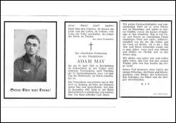 Gefallener 2. Weltkrieg; starb kurz vor Kriegsende an Folge einer schweren Verwundung; Eltern: Anton May u. Agnes geb. Becker; ∞ 19.12.1941 Maria Hackenbroich; 1 K.; 1.5.1941 zum Heer einberufen; Druck in Dormagen |