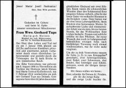 Mitgl. Kath. Mütterverein u. St.-Matthäus-Bruderschaft; Eltern: Jakob Meisen u. Maria Gertrud geb. Kollenbroich; 2 Söhne, davon 1 im 2. Weltkrieg gefallen; ∞ vor über 33 J. Gerhard Tups, † vgor 16 Monaten; 1 einziger Sohn in russischer Kriegsgefangenschaft |