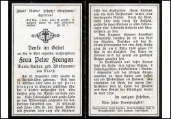 ∞ 11.10.1890 Peter Frangen; 3 K.; 3 Töchter, davon 1 †; längere Krankheit; Druck in Lank |