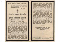 ∞ 13.5.1907 Lehrer Martin Költer; 3 Söhne, davon 1 mit 10 J. †; Druck in Lank |