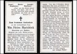 Mitgl. Kath. Mütterverein; längeres Leiden; ∞ 11.2.1888 Heinrich Marishink, † 12.5.1913; 8 K., davon 4 †; |