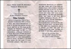 Eltern: Ehel. Hermann Schmitz; kaufmännische Lehre; ∞ 3.1.1953 Katharina Santen aus Lank; 1 Tochter; 2 Brüder im 2. Weltkrieg gefallen |