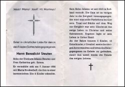 ∞ 7.1.1906 Maria Brockerhoff; 6 K.; Sohn Johann im 2. Weltkrieg seit 1945 in Russland vermisst; Eltern: Johann Steuten u. Katharina geb. Esters, † vor 1 J.5 überlebende Kinder |