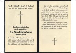 82 J.; lange, schwere Krankheit; ∞ Heinrich Tourné, † 1942; 2 Söhne im 2. Weltkrieg gefallen; 3 überlebende Kinder |
