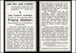 ∞ 23.9.1887 Agnes Hartmann; 8 K., davon † 1 Tochter Aug. 1902, 1 Sohn fiel im 1. Weltkrieg. Seitdem kränkelte seine Gattin, † 30.4.1919; Brudermeister der St. Sebastianus-Bruderschaft; Druck in Krefeld-Bockum |