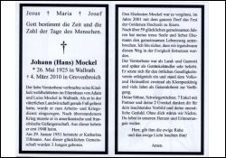 Eltern: Ehel. Adam u. Luise Mockel; Soldat im 2. Weltkrieg; 1948 Rückkehr aus amerik. U. frz. Kriegsgefangenschaft; ∞ 29.1.1951 Katharina Tillmann; 3 Söhne; 2001 Goldhochzeit; Land- u. Gastwirt, später Getränkehändler; zweimal Klompenkönig in Wallrath |