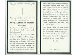 Eltern: Johann Küpper und Anna Schmidt; ∞ Kornelius Thiesen 4.2.1940 †; 2 K. |