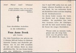 Lange, schwere Krankheit; Eltern: Heinrich Corsten u. Mechtilde geb. Pilatus; ∞ 12.7.1940 Johann Beeck; |