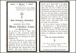 ∞ 14.1.1888 Wilhelm Josef Conen aus Katzem, † 5.4.1927; 12 K.; Druck in Granterath |