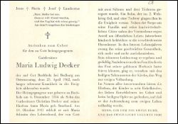Gutsbesitzer; Eltern: Gutsbesitzer Christian Decker u. Anna Maria geb. Saurland; ∞ 19.10.1911 Maria Schmitz; 5 K.; 1 Sohn im 2. Weltkrieg gefallen; 1 Tochter †; verschiedene Ehrenämter; in den letzten Jahren schweres Leiden |