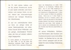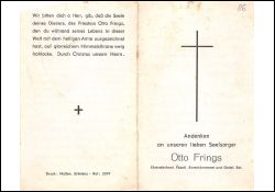 79 J.; Eltern: Geh. Justizrat Peter frings u. Maria geb. Klausener; Priesterweihe Köln 17.6.1905; 4 J. am Hubertinum in Godesberg, 11. J. Lehrer am kath. Lyzeum in Düren; 11 J. Pfarrer in Schleiden, daa 25 J. in Erkelenz, davon die letzten 9 J. Pfarrektor in Tenholt; die letzten 4 J. Seelsorger im Hermann-Josef-Stift in Erkelenz |