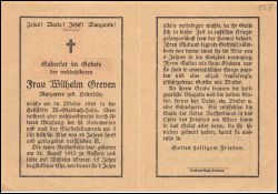 vor 15 J. ∞ Wilhelm Greven; 3 K., davon 1 mit 5 J. †; ihr Mann war in russischer Kriegsgefangenschaft; Druck in Erkelenz; |