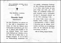 Schmiedemeister; Eltern: Jakob Ludwig Diehl u. Katharina geb. Heid; ∞ 8.2.1908 Elisabeth Welter; 5 K., davon 1 früh †; lange Krankheit |