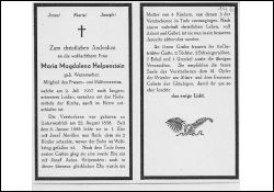 Mitgl. Frauen- u. Mütterverein; langes, schweres Leiden; ∞ 8.1.1888 Josef Mewißen aus Rath, †; 2 K., davon 1 Sohn im 1. Weltkrieg gefallen; ∞ Anton Helpenstein; 4 K., davon 3 †; |