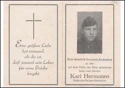 Gefallener 2. Weltkrieg; Eltern: Karl Hermanns u. Katharina geb. Trippelsdorf; 13.1.1943 rAD; 20.4.1943 zur Wehrmacht; Einsazu in Rumänien u. Ungarn; gefallen bei Kämpfen um Breslau; |
