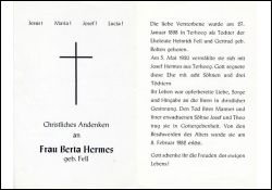 Eltern: Heinrich Fell u. Gertrud geb. Bolten; ∞ 5.5.1920 Josef Hermes aus Tersteeg, † ; 11 K.; die erwachsenen Söhne Josef u. Theo †; |