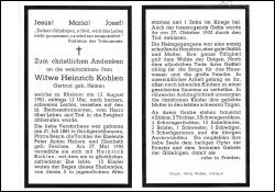 Eltern: Anton Heinen u. Elisabeth geb. Feschen; ∞ 27.5.1905 Heinrich Kohlen, † 27.10.1932; 13 K., davon 5 jugendlich † u. 1 Sohn im 2. Weltkrieg gefallen; |