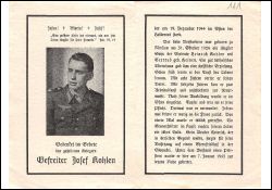Gefallener 2. Weltkrieg; Eltern: Heinrich Kohlen u. Gertrud geb. Heinen; mit 17 J. RAD, anschließend zur Wehrmacht; dreimal im Osten verwundet, jedesmal zurück an die Front; Ehrenfriedhof in der Slowakei; Beisetzung in Gegenwart des Bruders Heinrich am 7.1.1945 |