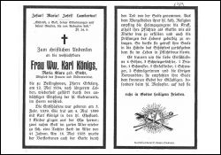 Längeres Leiden; ∞ 4.5.1889 Karl Königs, † 16.5.1928; 7 K., davon 2 früh †, 1 Tochter † mit 41 J.; |