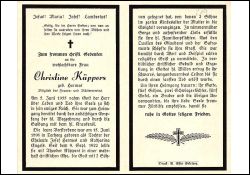 Mitgl. Frauen- u. Mütterverein; Eltern: Josef Hermes u. Katharina geb. Engels; ∞ 9.9.1922 Theodor Küppers; 7 Söhne, davon 2 früh ; langes Leiden; Druck in Erkelenz |