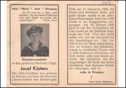 Gefallener 2. Weltkrieg; Kriegsmarine; Eltern: Lorenz Küsters u. Barbara geb. Peitz; 9.1.1942 zur Kriegsmarine eingezogen; Todesnachricht erreichte die Eltern erst 3 J. später; Druck in Hückelhoven |