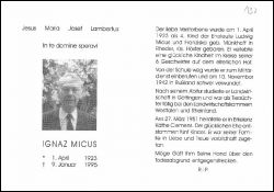 Eltern: Ludwig Micus u. Franziska geb. Münkhoff; von der Schule weg zum Militärdienst einberufen; 10.11.1942 in Russland schwer verwundet; nach Abitur Studium der Landwirtschaft; als Tierzüchter bei den Landwirtschaftskammern Westfalen u. Rheinland tätig; ∞ 27.3.1951 in Erkelenz Käthe Clemens; 5 K. |